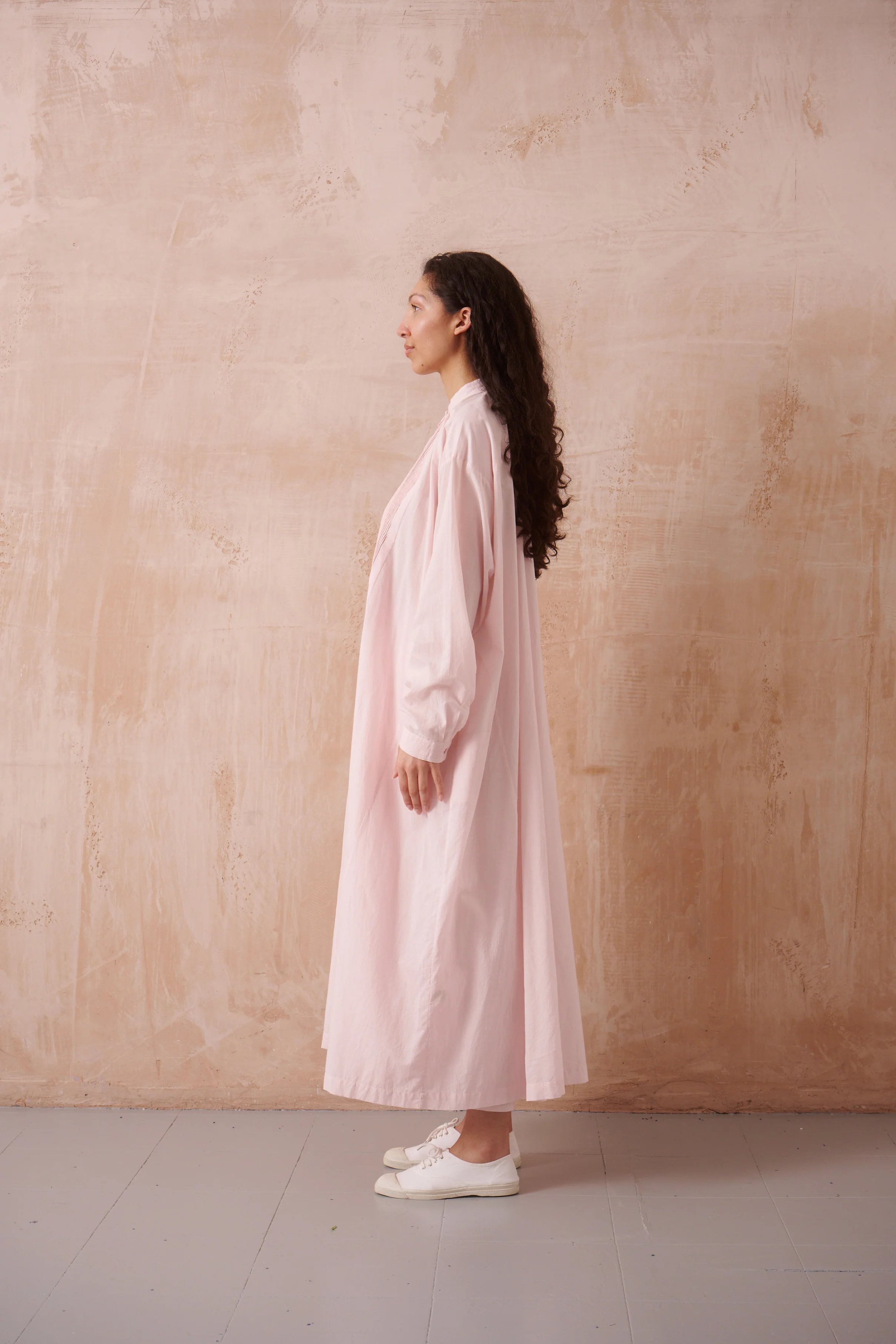 long sleeved dress, pin tuck bib front, buttoned cuffs, side seam pockets